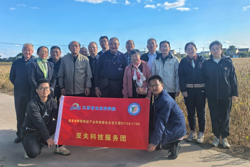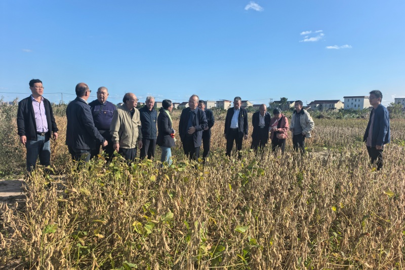随后,党员们走进经济作物研究室在启东市设立的亚夫项目“特粮特经产业科技综合引领”示范基地——寅阳镇禾润家庭农场。在田间地头,大家实地观摩沿江所选育的通豆13、17、18、20等大豆品种的成熟期长势,详细了解夏大豆增密化控技术、全程机械化生产等关键技术的应用成效。启东市农业技术推广中心副主任、亚夫项目骨干成员施永军现场重点介绍沿江所大豆品种在抗病性、产量和品质等方面的优势,以及配套技术对提升生产效率、促进农民增收的重要作用。沿江所当前在品种选育、技术研发与集成应用上的坚守,与百年前张謇先生“试验以竞世界,观摩以启民智”的初心高度契合,彰显了两代农业人跨越时空的精神共鸣与使命传承。