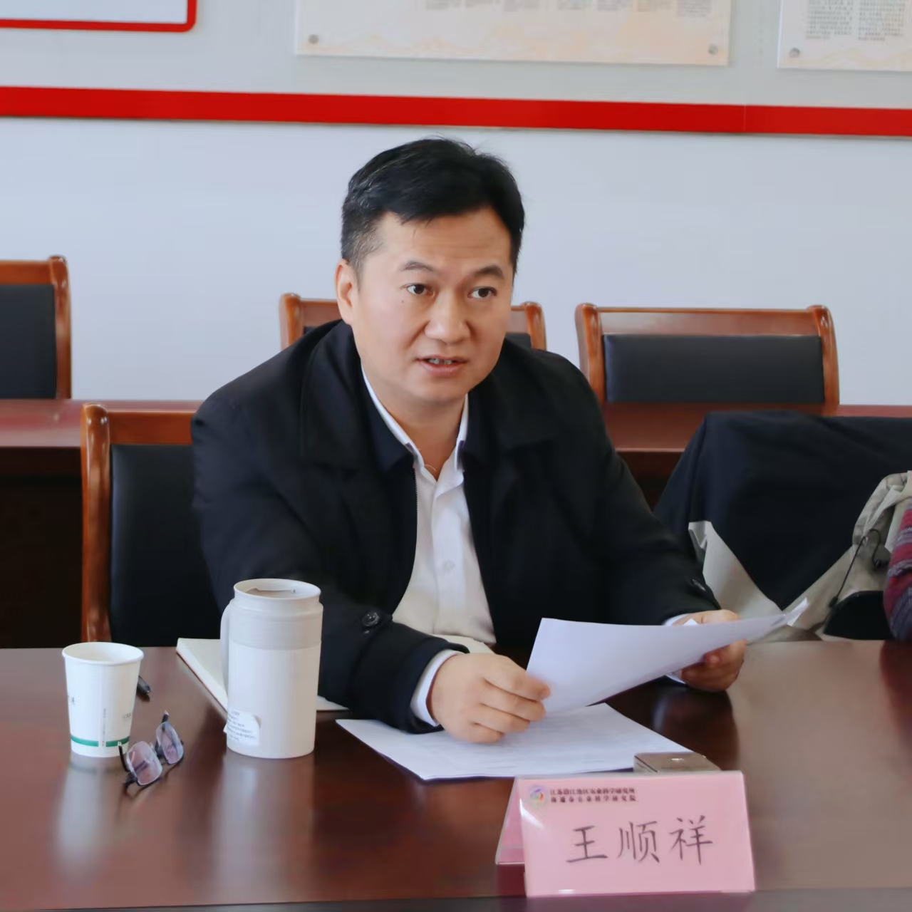 11月28日,通州湾示范区农业农村办公室主任、三余镇党委书记王善文一行来所交流合作事宜。通州湾示范区农业农村办公室副主任、三余镇副镇长石磊,三余镇农业农村工作局局长施红杰一同到访。所长王顺祥主持接待。