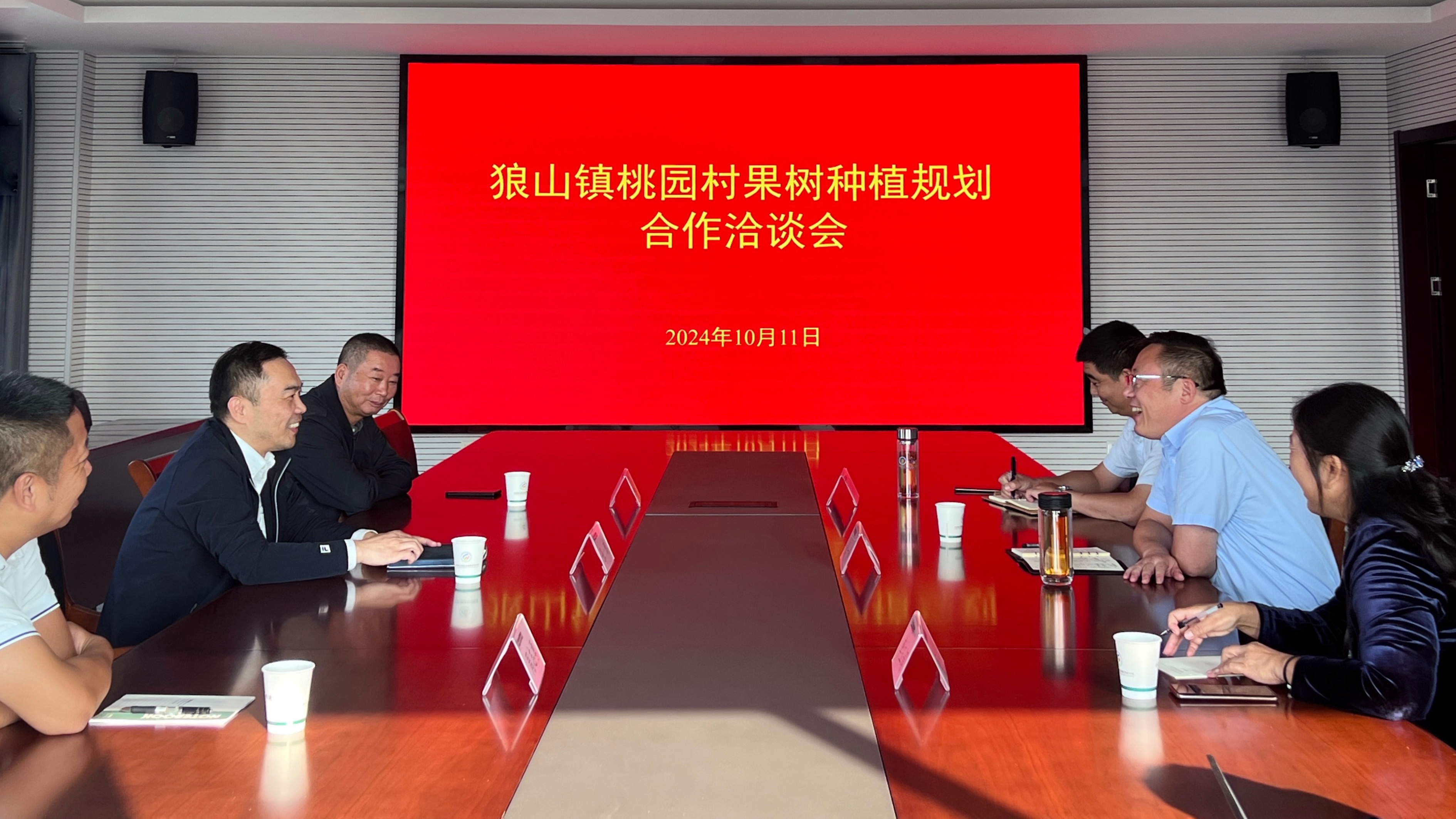 在合作洽谈会上,张一峰所长首先介绍了我所的基本情况及近年来在科技创新和科技服务方面取得的成绩;张鹏副书记详细介绍了狼山街道及规划田块的基本情况,希望在果树种植规划、林地资源利用以及林下经济作物种植等方面开展多种合作;李玉娟主任详细介绍了休闲农业团队近年来在林木果树领域的研究进展、技术服务与业务能力。与会人员进行了充分的交流,并最终达成了合作共识。张一峰所长针对狼山镇集体资产的保值增值问题,提出了优化的发展思路,并表示我单位将全力支持狼山镇的美丽乡村建设。