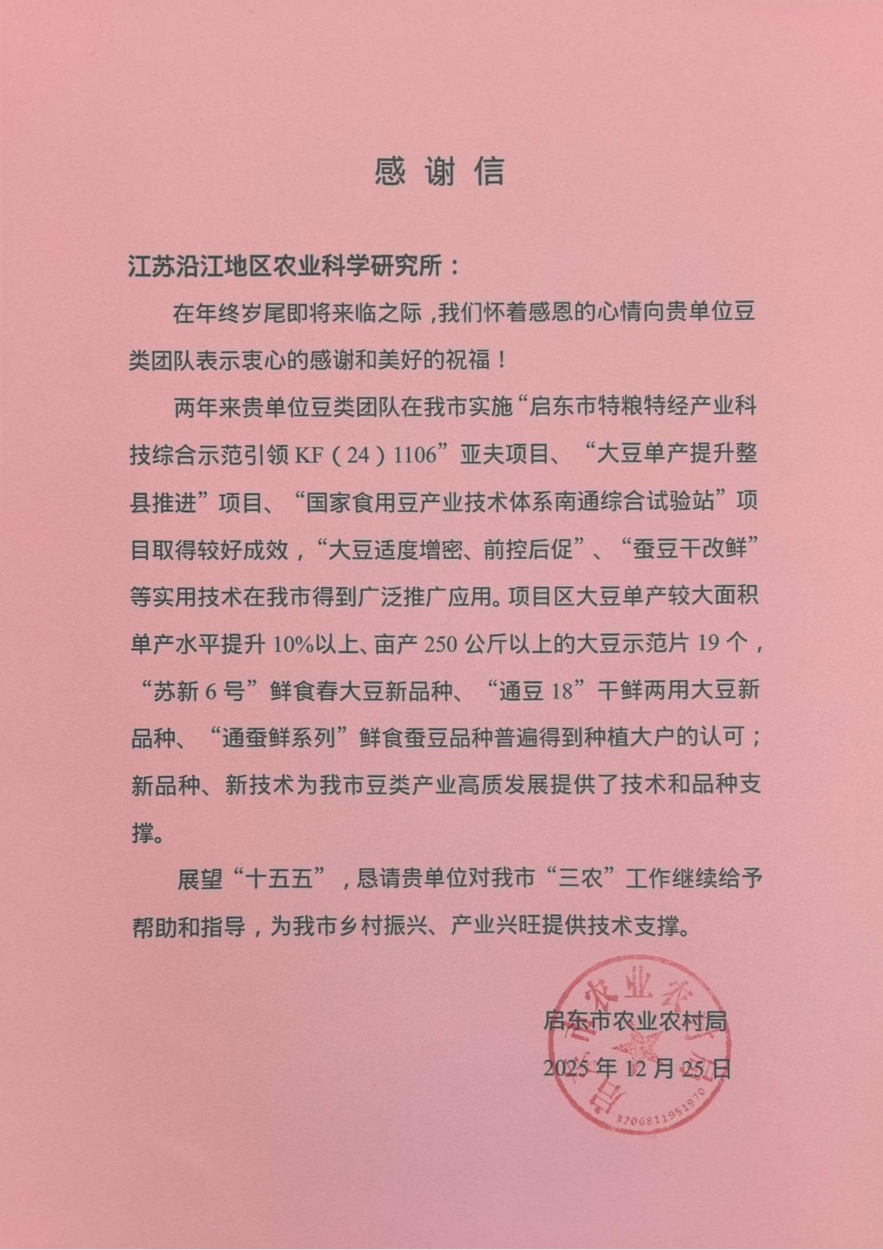 江苏沿江地区农业科学研究所一直致力于农业科技创新与服务地方产业发展,豆类研究团队作为我所重要科技力量之一,长期深入生产一线,围绕产业需求开展攻关与示范。此次收到感谢信,既是对团队工作的充分肯定,也是对我所扎根田野、服务“三农”使命担当的鼓舞。下一步,我所将继续坚持问题导向和需求导向,进一步深化与启东市等地方农业部门的合作,推动更多农业科技成果落地转化,为保障粮食安全、促进农民增收贡献更多智慧和力量。