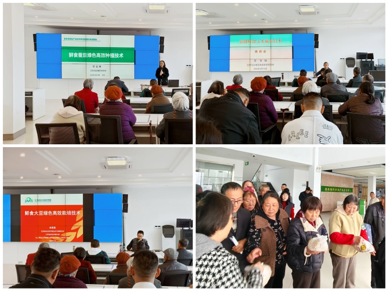 本次活动分为两部分进行,上午首先举办科技培训会,项目组成员、中部及北部区域服务中心农技推广人员、特粮特经作物经营主体、种植大户等60余人参加。会上,省院经作所、省科技传播专家薛晨晨副研究员做《鲜食大豆绿色高效栽培技术》培训,围绕鲜食大豆产业发展现状与种植关键技术展开讲解,内容涵盖播前准备、播种时期、栽培模式、病虫草害绿色防控及适时采收等要点,并对比分析了不同播期鲜食大豆在管理上的区别。随后,玉米团队冒宇翔研究员做《春播鲜食玉米栽培技术》培训,主要从糯玉米生育特性和春播鲜食玉米田间种植管理两部分展开,系统介绍了鲜食玉米播前准备、种子选用原则与处理方法、土地选择与准备、适宜播期、各类播种技术及不同生育期管理等。最后,缪亚梅研究员作《鲜食蚕豆高产高效栽培技术》培训,主要针对当前鲜食蚕豆田间管理技术进行讲解。整场培训内容丰富翔实、实用性强,参会人员认真学习领会,成效良好。会后还免费发放了鲜食大豆新品种“通豆18”种子与栽培技术资料。